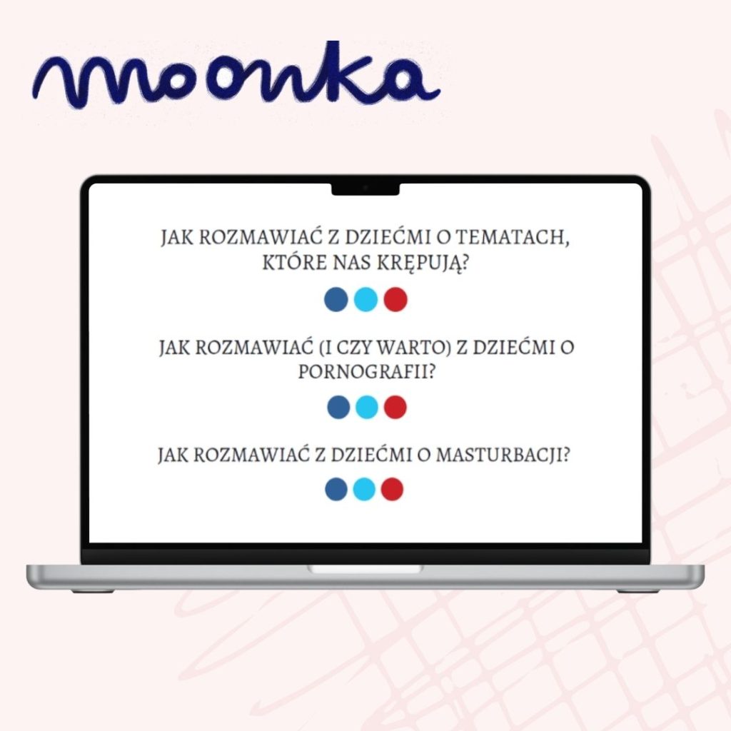 Na stronie Moonki znajdziesz trzy rozmowy ze mną: o rozmowach na krępujące tematy, o tym, jak rozmawiać z dziećmi o pornografii, o tym, jak rozmawiać z dziećmi o masturbacji.